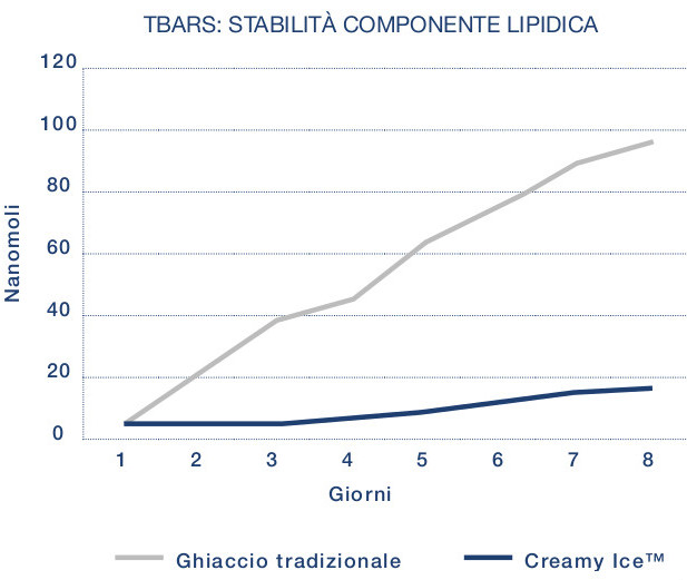 Il TBARS evidenzia la formazione di composti derivanti dall’ossidazione del tessuto muscolare. Nei campioni conservati con CREAMY ICE™ si evidenzia come l’irrancidimento della componente lipidica si mantenga basso.